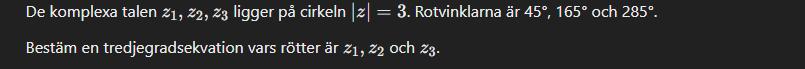 MrPotatohead skrev:Du får tre rötter i uppgiften. Multiplicera ihop dessa med hjälp av faktorsatsen så får du en tredjegradare.
