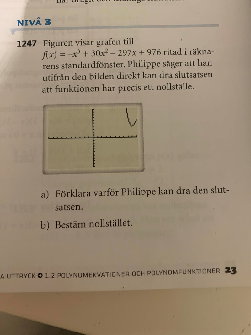 ItzErre skrev:vanligtvis i uppgifter då man ska göra liknande saker algebraiskt ska man använda kunskaper om derivata. Ofta kollar man på andra derivatans nollställen och hittar förstaderivatans maximumpunkt. Om denna maximumpunkt är negativ kan grafen bara ha 1 nollställe (Eftersom funktionen aldrig kommer kunna växa). Dock verkar inte detta fungera här