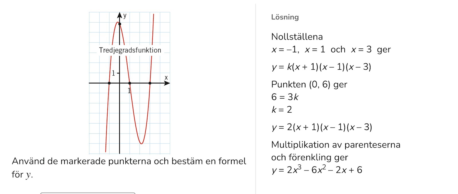 På samma sätt bestämmer k hur mycket en tredjegradskurva svänger upp och ned mellan nollställena. I detta fall vill vi att den skall gå igenom punkten (0,6). Om vi inte har k kommer kurvan gå igenom (0,3). Alltså måste vi sätta k=2 för att kurvan skall svänga uppåt tillräckligt mycket.