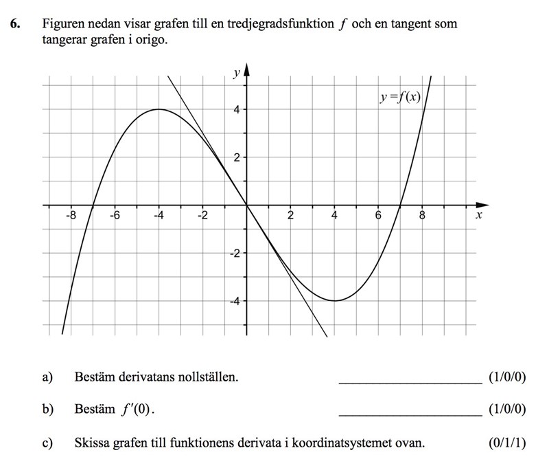 (c) Där f avtar är f’ negativ, där f växer är f’ positiv. Med hjälp av detta kan man göra en hyfsad skiss. Ska det bli mer noga får du bestämma C i ekvationen ovan och derivera.