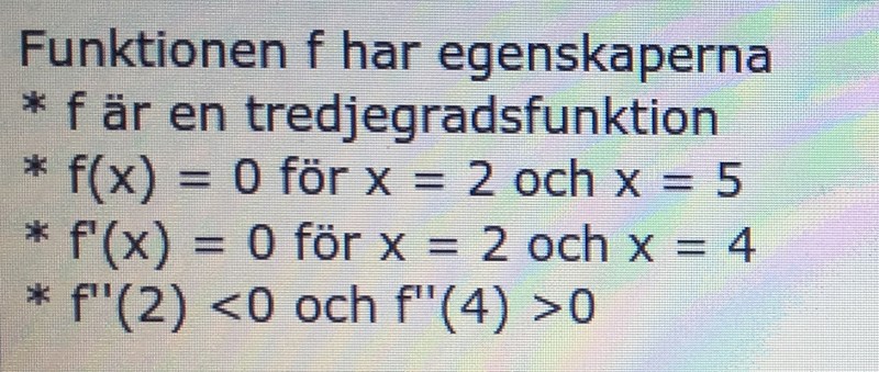 Maximipunktens x-koordinat är då 2 och det står i första villkoret att x=2 är ett nollställe. Då bör koordinaterna vara 2,0?