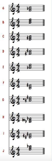 För ackorden är det kanske enklast att helt enkelt lyssna på dem. Har du tillgång till något piano (eller synt)?