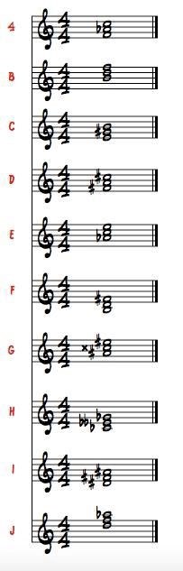 I alla fall, jag brukar räkna hur många halva tonsteg ifrån grundtonen de övriga tonerna är. Tar vi den första som exempel ser vi att den mittersta tonen är tre halva tonsteg över grundtonen samt att den översta tonen ligger sju halva tonsteg över grundtonen. Detta kännetecknar ett mollackord. Hade vi haft 4 och 7 hade det blivit ett durackord, och hade vi haft 3 och 6 hade det blivit ett dimackord o.s.v.