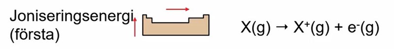 Om man studerar hur (t ex första) joniseringsenergin ändras i samma period, så ökar den åt höger - ju längre åt höger,desto fler protoner i kärnan.