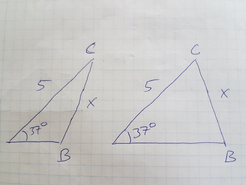 Här är ett exempel där ett visst värde på x ger två trianglar. En triangel med trubbig vinkel vid B (till vänster) och en triangel med spetsig vinkel vid B (till höger).