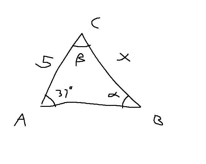 I triangeln ABC är ^A = 37, sidan AC = 5 och sidan BC = x cm