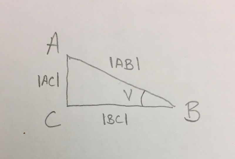 Om du kollar i figuren jag laddade upp så ser du att |AB| är hypotenusan, |AC| är motstående katet till v och |BC| är närliggande katet.