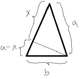 a)I en likbent triangel är basen b och de båda lika långa sidorna a. Höjden mot en av de lika långa sidorna delar denna i två sträckor. Bestäm dessa uttryckta i a och b.