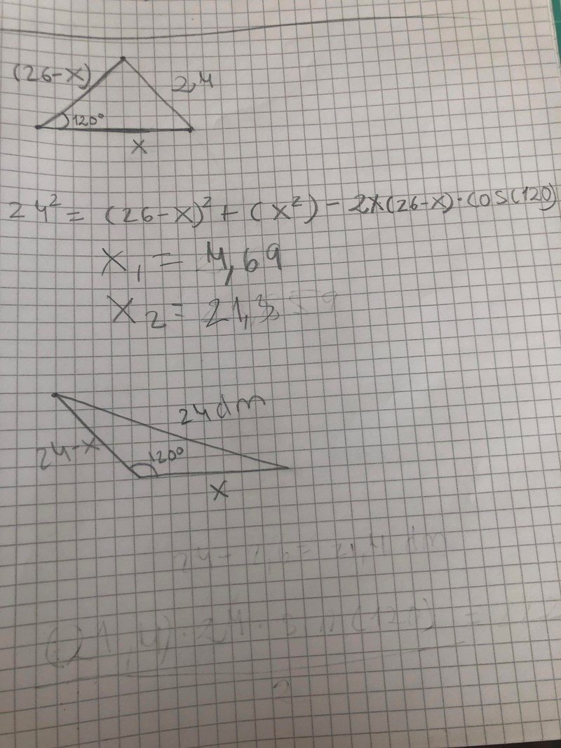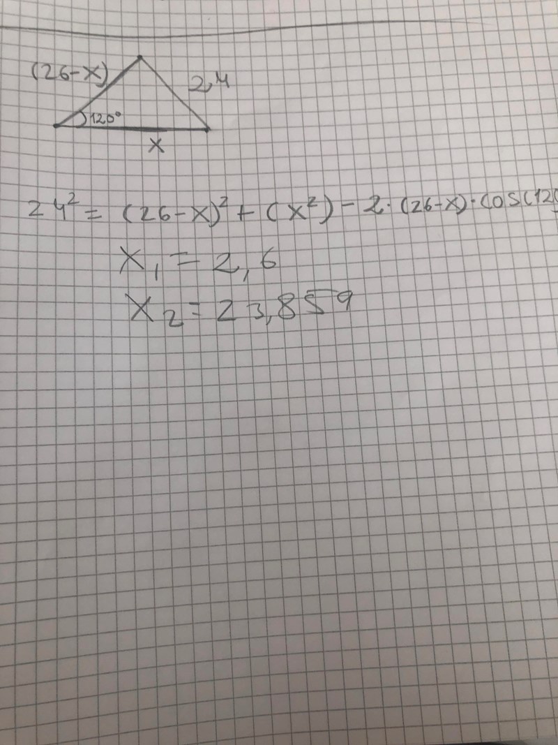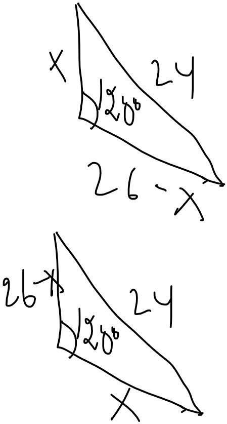 24^2=(26-x)^2+x^2-2x(26-x)cos(120)