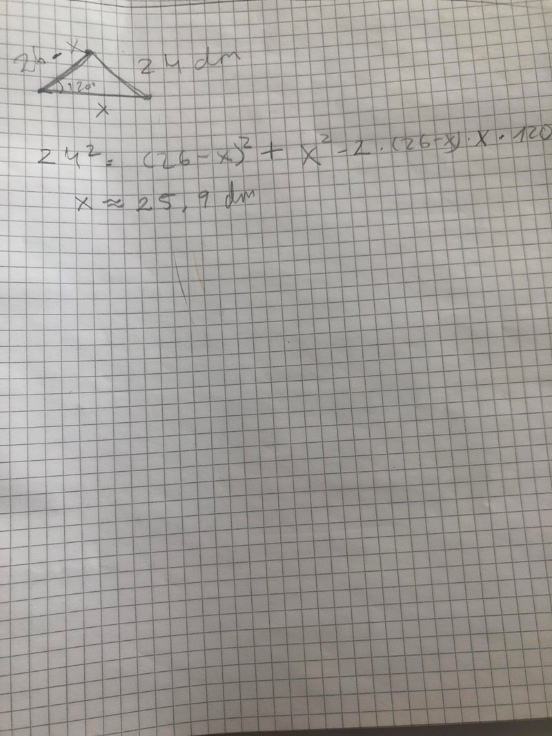 I ditt fall är c=24, a=x, b=26-x, φ=120 grader