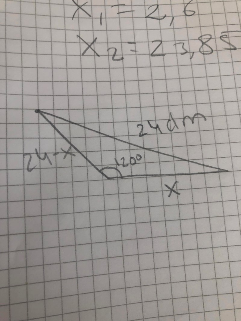 Kalla triangelns sidor för a, b och c, där vi vet att sidan c har längden 24 dm och att motstående vinkel (dvs vinkeln mellan a och b) är 120°.