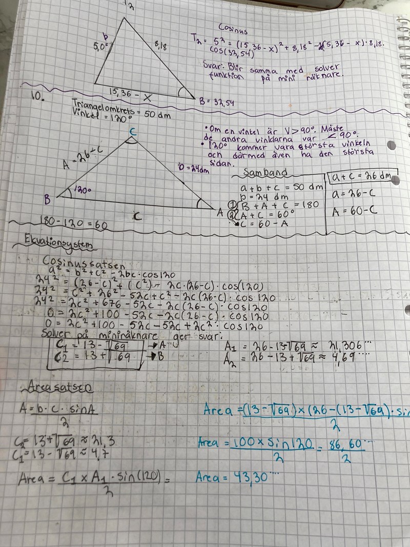 Du verkar ha glömt att det ska vara cosinus för vinkeln i cosinussatsen.