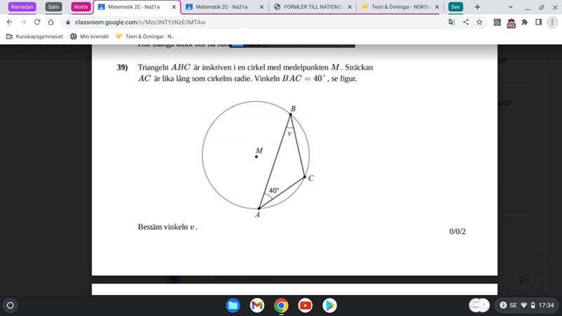 Drag linjerna MA och MC. AMC är en liksidig triangel varför vinkeln AMC = 60°.