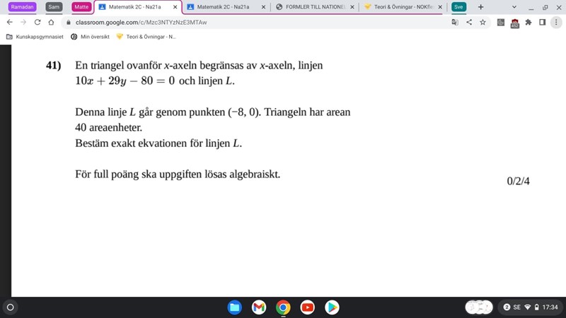 Mattehjalp skrev:Mattehjalp skrev:Jag tänker att jag ritar en linje som skär -8 i x-axeln och som har en positiv lutning, men hur ska jag rita den givna linjen, den har massa decimaltal