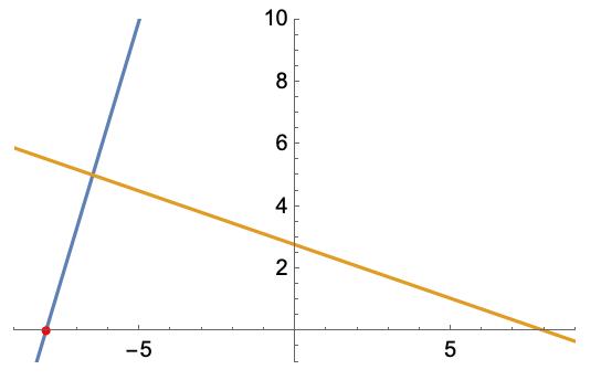 x-kordinaten vi får fram tillsammans med y-kordinaten (15,27) ger oss en punkt på linje 2 och vi har redan punkten (-8,0) och genom de två punkterna bör vi få ekvationen för linje 2