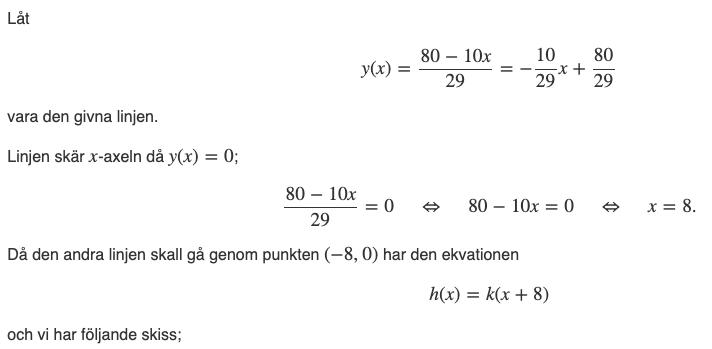 Mattehjalp skrev:Jag tänker att jag ritar en linje som skär -8 i x-axeln och som har en positiv lutning, men hur ska jag rita den givna linjen, den har massa decimaltal