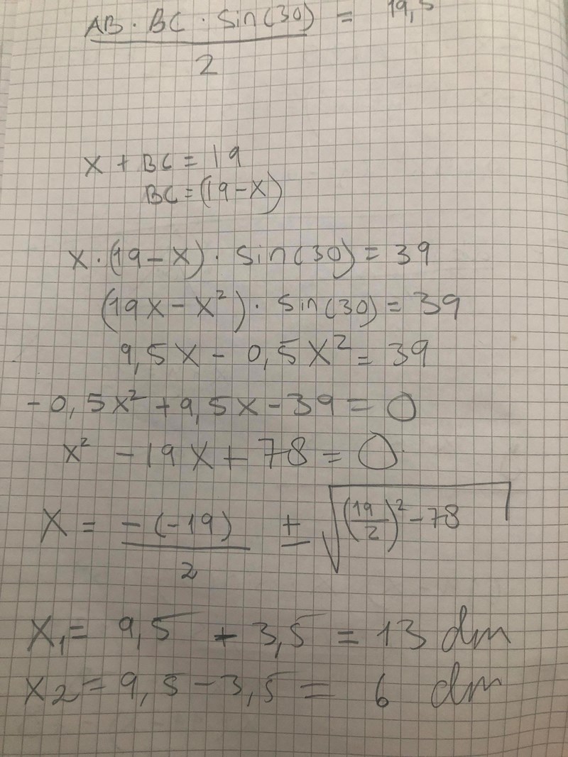 "I en triangel ABC är vinkeln A = 30°. Sidorna AB och AC är tillsammans 19 cm. Bestäm sidan AB om triangelarean är 19,5 cm²."