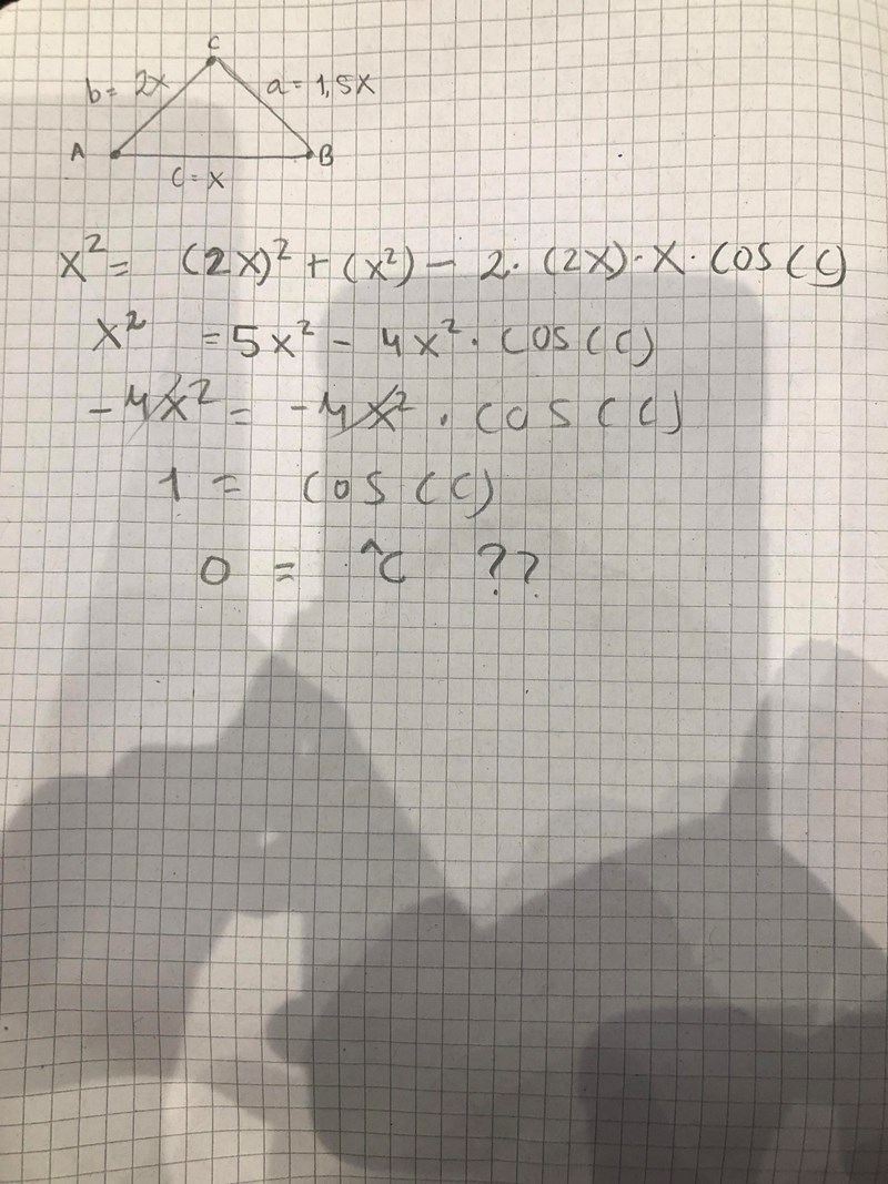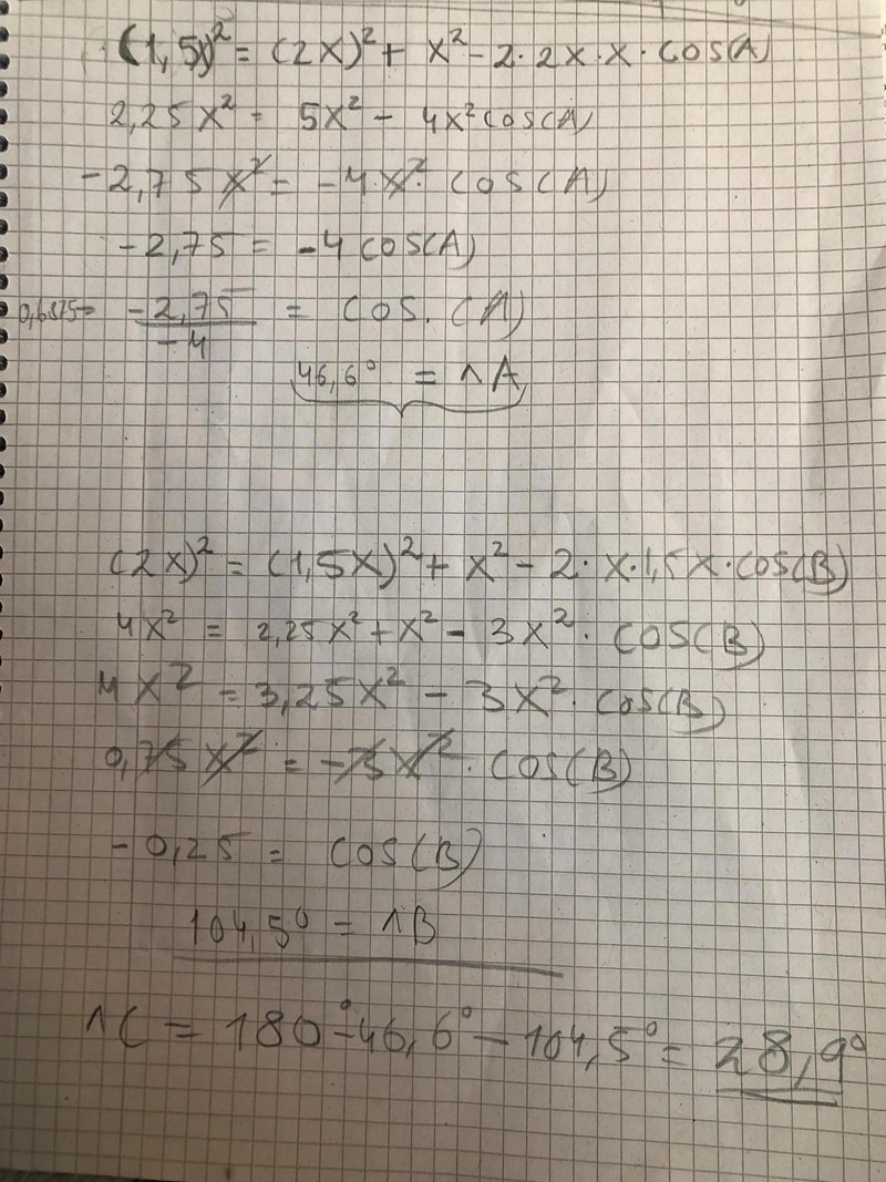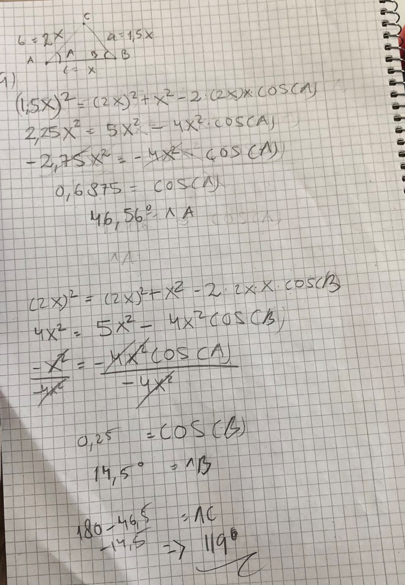 x^2=(1.5x)^2 + (2x)^2 - 2*1.5x* 2x * cos (C)