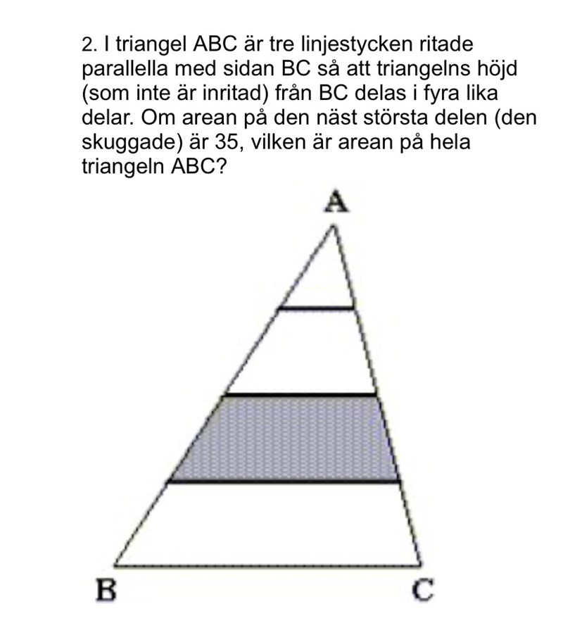 Trianglarna är lika stora. Om de inte ser ut att vara det, har jag ritat fult.