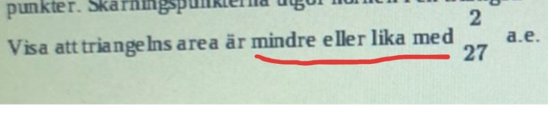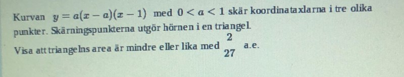 Du vill visa att oavsett hur stor triangeln blir så blir arean inte större än 2/27.