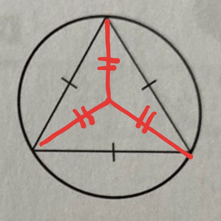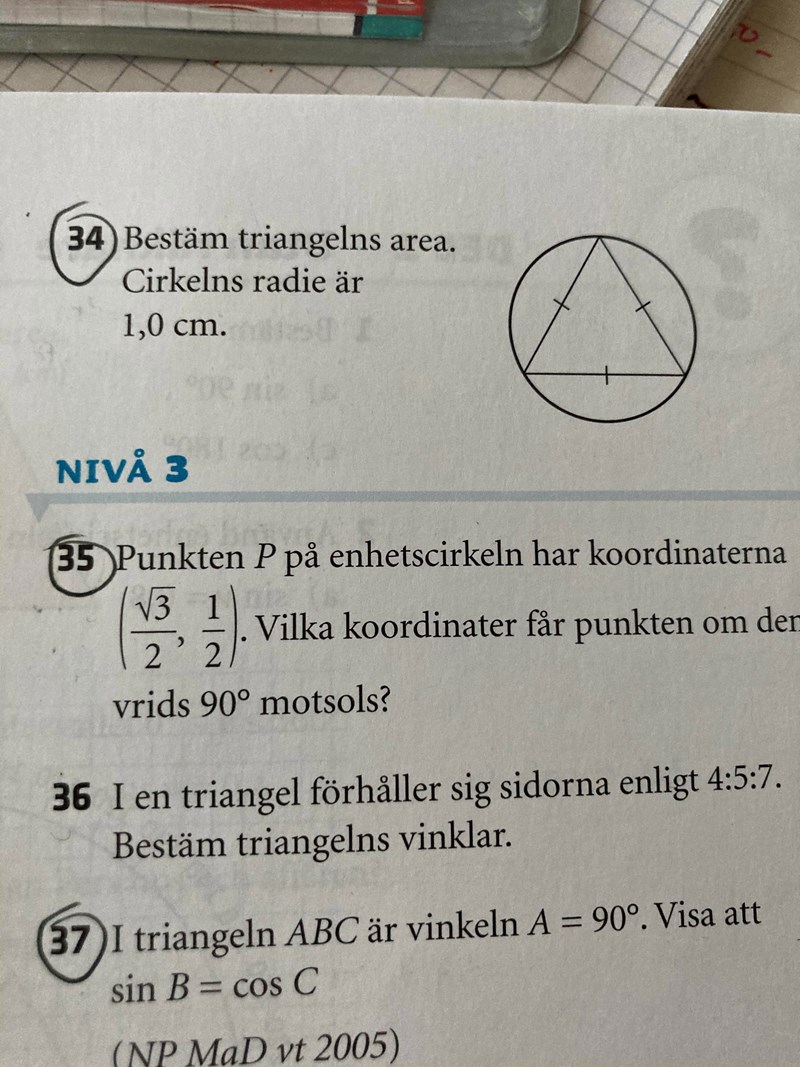 Hm. Som du säger den är väldigt krånglig. Är det tänkt att man ska skriva två ekvationer för 1 rätvinklig triangel i stora triangeln och för 1 av de rätvinkliga trianglarna i den du räknade, kanske? Eller vänta nu tror jag att jag ser, de sidor som du ritat med två sträck blir väl cirkelns radie? Jo men såklart! Då beräknar jag det med area satsen. 1x 1x sin (120)/ 2. I och med att alla trianglar är likformiga så blir gradtalet i mitten 360/3. Sen adderar jag de 3 arearna. Tack så mycket!