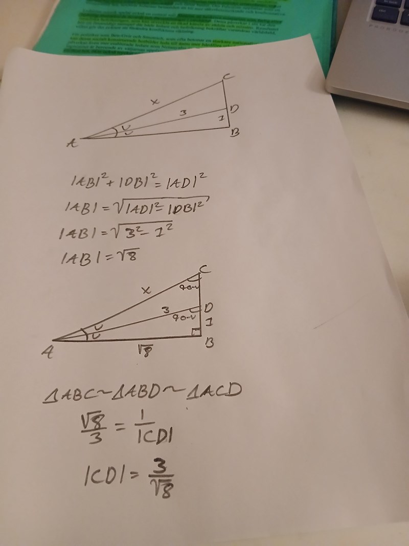Man kan lösa på flera olika sätt väl som pythagoras, likformighet. Men uppgiften är nog tänkt att lösas mha trigonometri