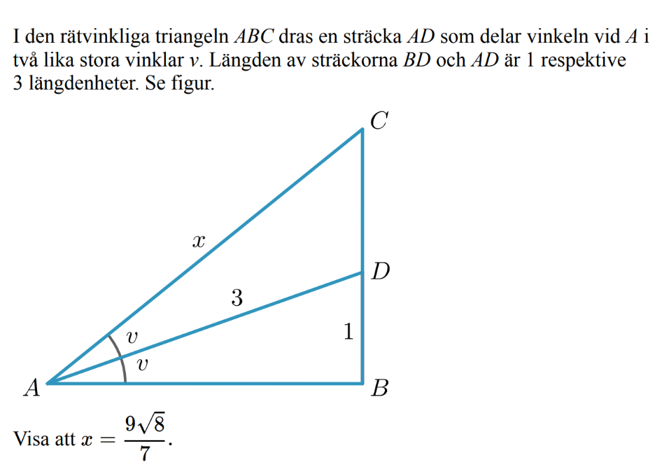 Om du kollar på triangeln får du att vinkeln vid faktiskt är och denna triangel är rätvinklig från vilket du, på samma sätt, får att vinkeln vid är .