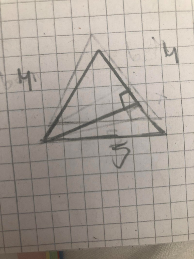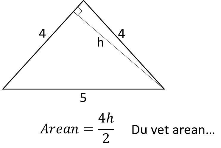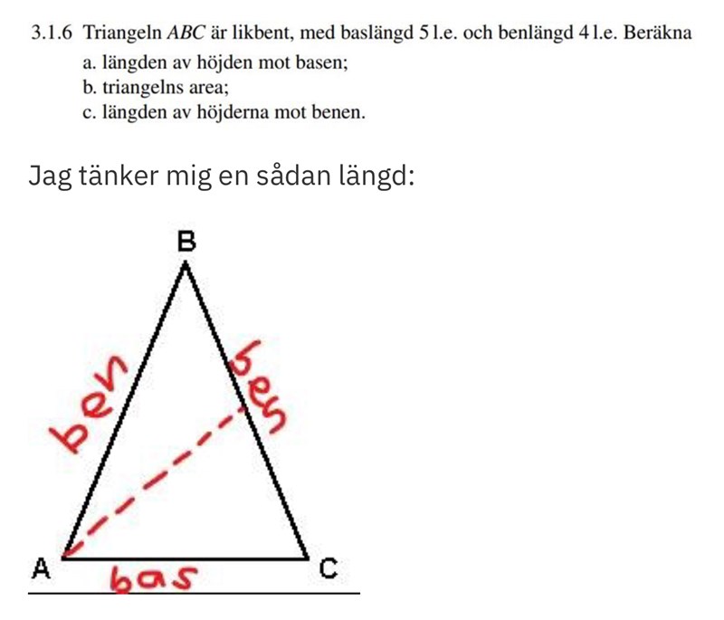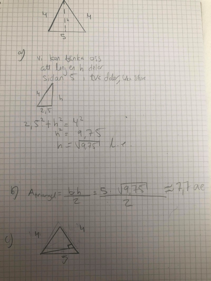 Den är ju fortfarande inte 90 grader..., men huvudsaken är att du kan ju utnyttja att du vet arean (från b-uppgiften) och ställa upp arean med ett ben (4) som bas istället och teckna efterfrågan höjd med tex h.