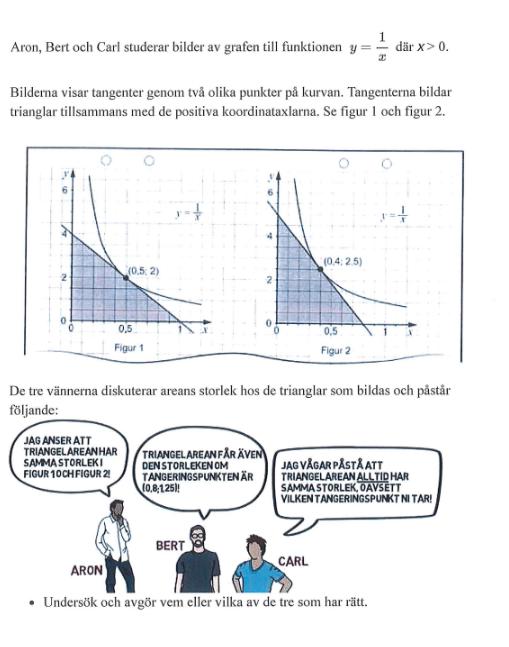 Men jag vet inte riktigt hur jag ska fortsätta, eftersom jag behöver veta var tangenten skär x-axeln för att räkna ut arean, men när jag försökte räkna ut det gick det inte riktigt.