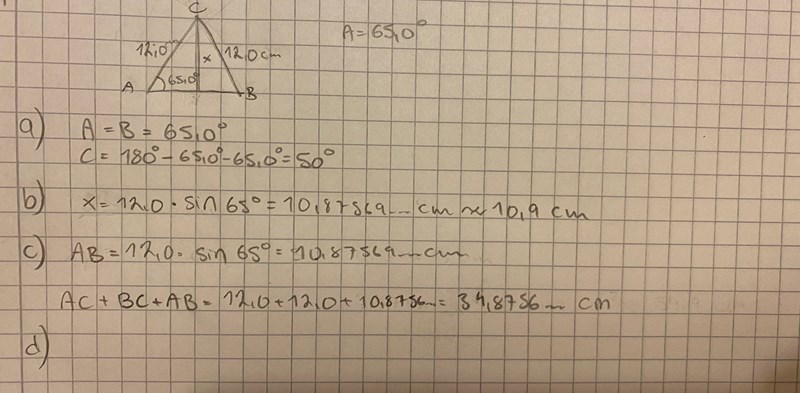 a) Eftersom att triangeln är likbent så är två trianglar 65,0° och den tredje är 180°-(65,0°•2) = 50°.