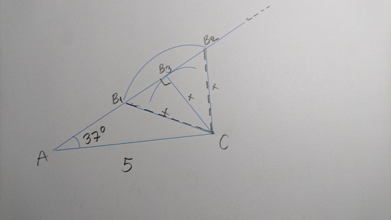 I min skiss har jag som exempel lagt den som B1 till C. Men den längden på x finns även mellan B2 och C - beskrivet som radien i en cirkel med medelpunkten i C. Samma radie och samma värde på x - men då får du 2 trianglar , AB1C och AB2C.