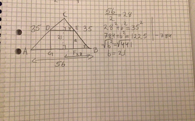 Triangeln ABC är likbent. Dess två lika långa sidor är 35 cm och dess bas är 56 cm. Kvadraten DEFG har sidan a cm. Bestäm arean av triangeln BEF.