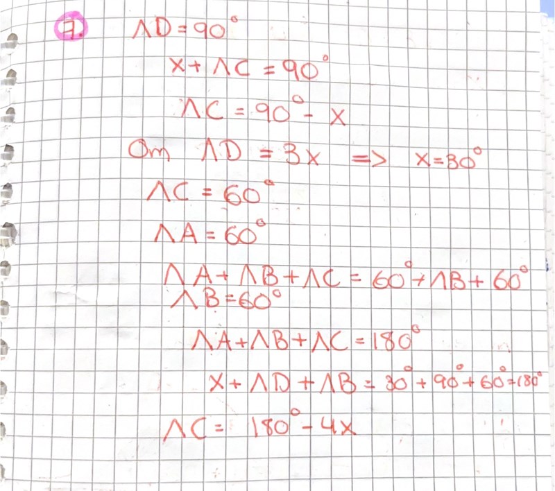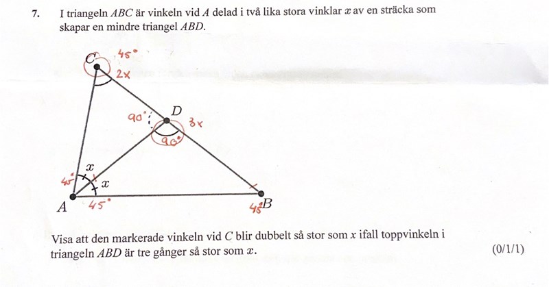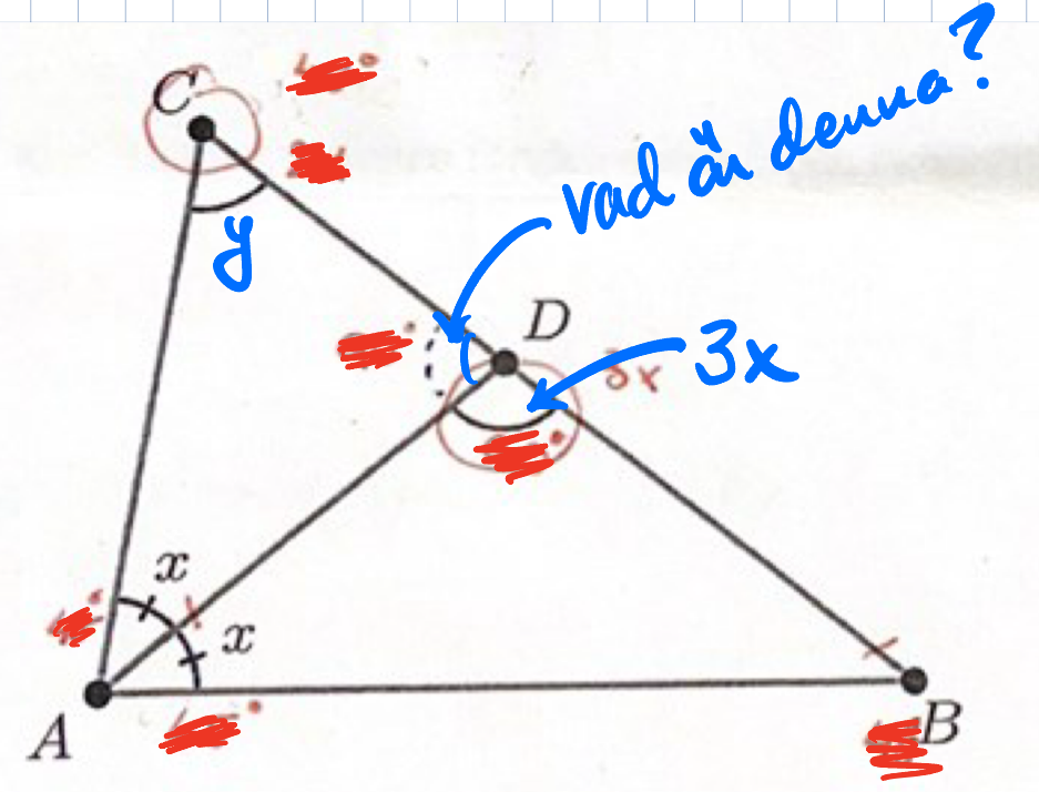 Fundera lite på vad sidovinkeln till vinkeln 3x (vid D) är och vad du kan säga om vinkelsumman för triangeln ACD.