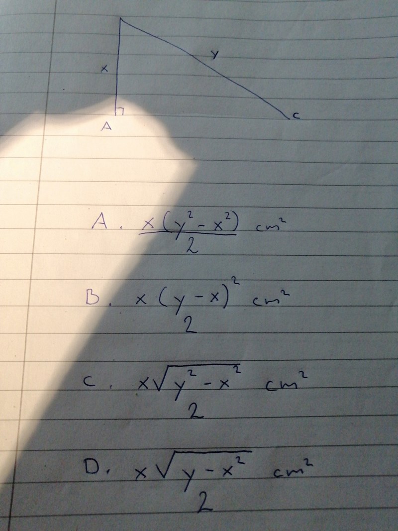 • I triangelns ABC är vinkeln A rät. AB är x cm och BC är y cm.Vilketuuttryckbbeskriverttriangelnssaare?Nedanför triangeln visas 4 svarsalternativ. Kan det vara  Pythagoras sats?