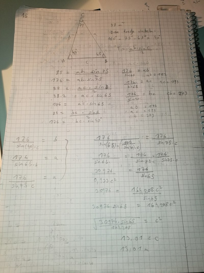 Jag ska beräkna uppgift 15 på sidan 241 i matematik 3c 5000 boken som handlar om två angivna vinklar dvs 75 och 65 med arean 88 m^2. Beräkna triangelns längsta sida