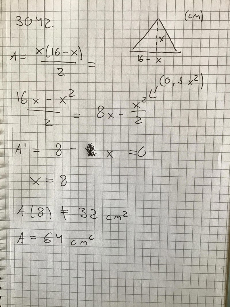 Enligt facit är den maximala arean 64cm2, jag fick 32cm2 och vet inte vad jag gjort fel