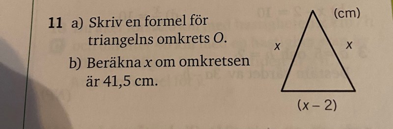 Men B då? Ja tänkte såhär om hela alltså omkretsen är 41,5 cm ska man inte göra de till en ekvationslösning?