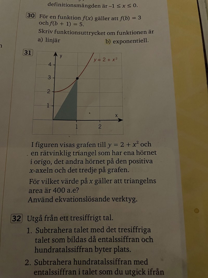 Fråga 31 här löste jag genom att skriva ekvationen x(x2+2) /2 = 400 och Y = 2 + X^2 i geogebra och kolla skärningspunkten. Så svaret är 9.21