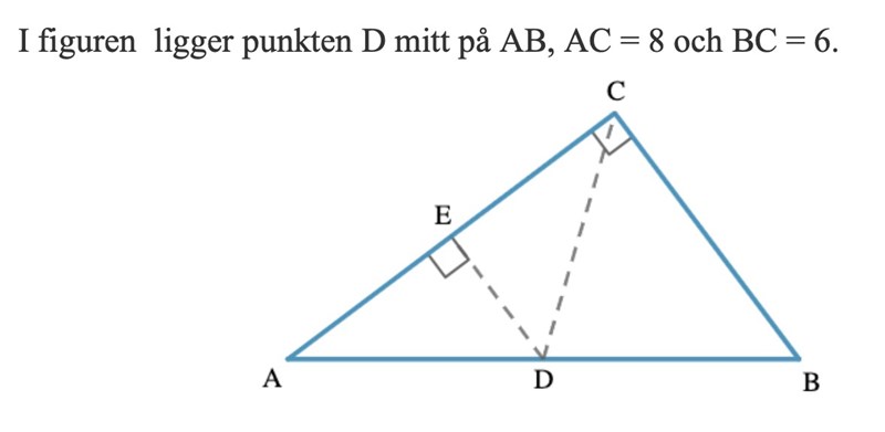 Jag vet liksom inte hur jag ska göra. Jag har försökt ta reda på alla sidor/sträckors längder för att beräkna arean av de två trianglarna. Jag har kommit fram till att AB är 10 cm och ED är 3 cm. Till triangel ACD har jag fått arean 12cm2, men på BCD vet jag inte vad jag ska ha för värde på höjden.