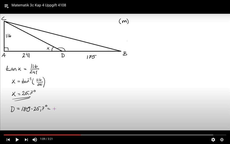 Varför tar han 180-25,7 är en halv cirkel 180 grader? sen hur vet man att om man tar motstående katet/närliggande katet att man får JUST den vinkeln bredvid 90 grader och inte den vinkeln vid C?