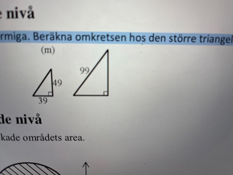 Nej. Kateterna i den lilla triangeln är 39 resp 49. 39*1,57 resp 49*1,57 blir kateterna i den stora triangeln. Utför multiplikationen och summera sidlängderna så får du omkretsen.