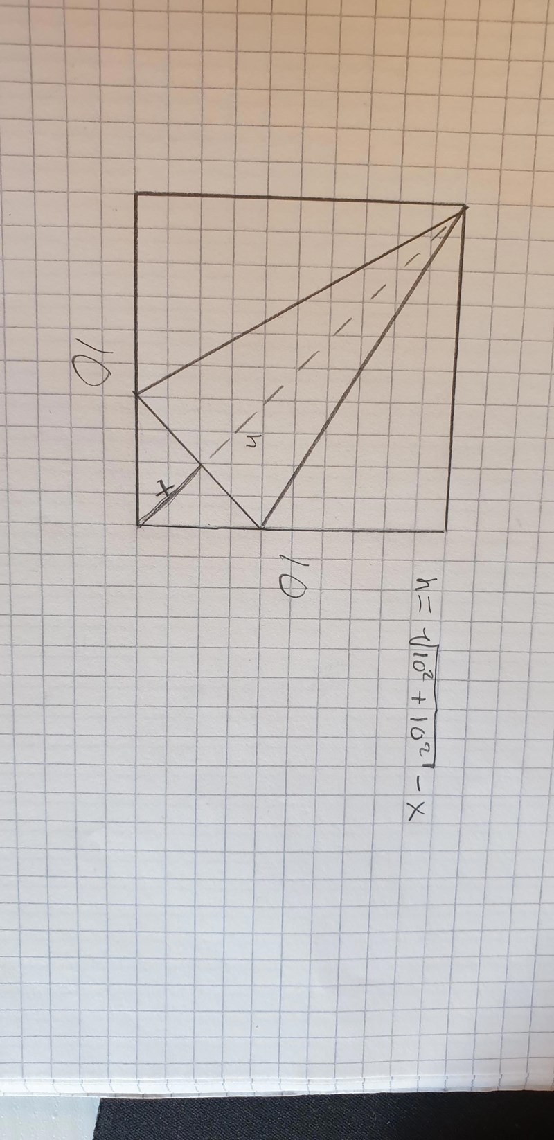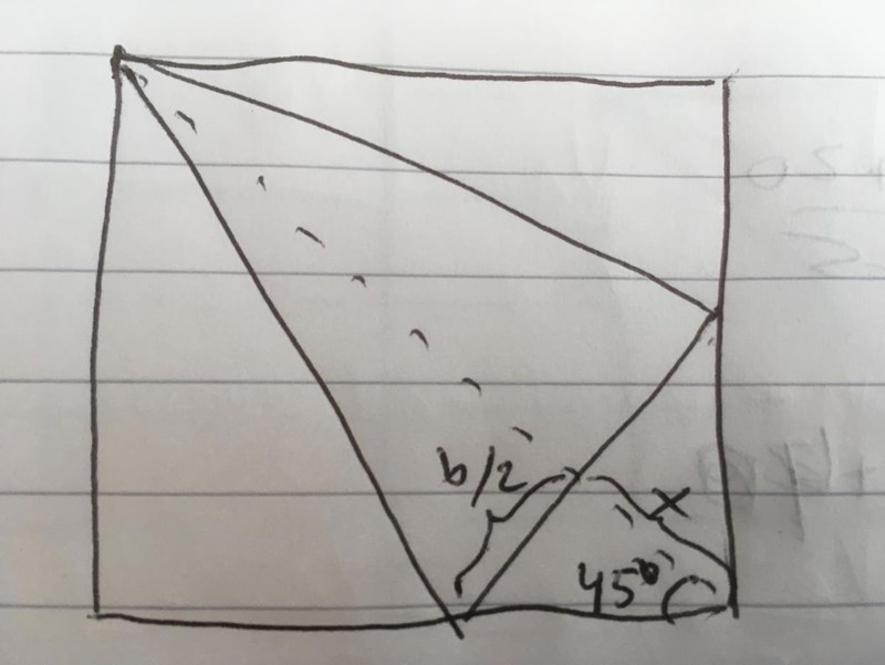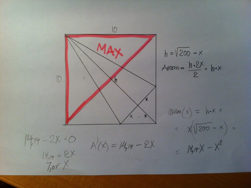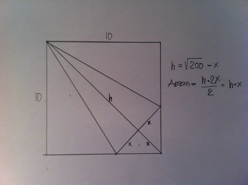 Så mitt problem är att sätta upp ett uttryck för triangelns area. Eftersom vi har sidan på kvadraten så använde jag Pythagoras sats för att räkna ut diagonalen. Sedan kallade jag triangelns höjd (hypotinusan - x). Men jag kom ingen vart eftersom jag inte på något vis lyckades få ut basen. Jag hade en tanke att det kanske skulle kunna gå att använda det faktum att triangeln var likbent, och därmed att vinklarna på de nedre hörnen var lika stora, men även där lyckades jag inte få något vidare resultat.