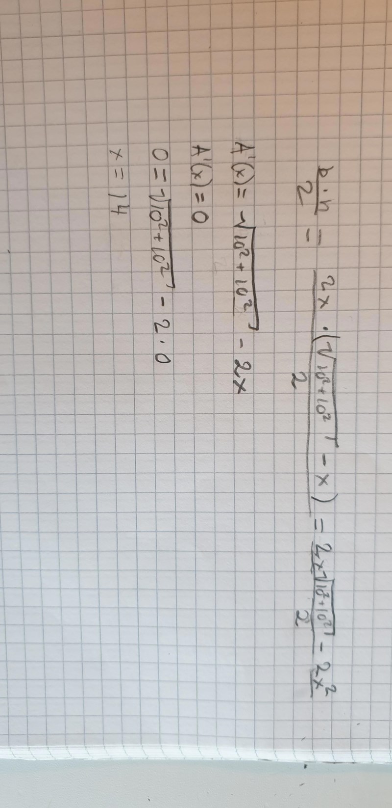 satte upp uttrycket, och deriverade som jag gjort på liknande uppgifter. Men svaret ska vara 50, så jag har gjort någonting fel någonstans