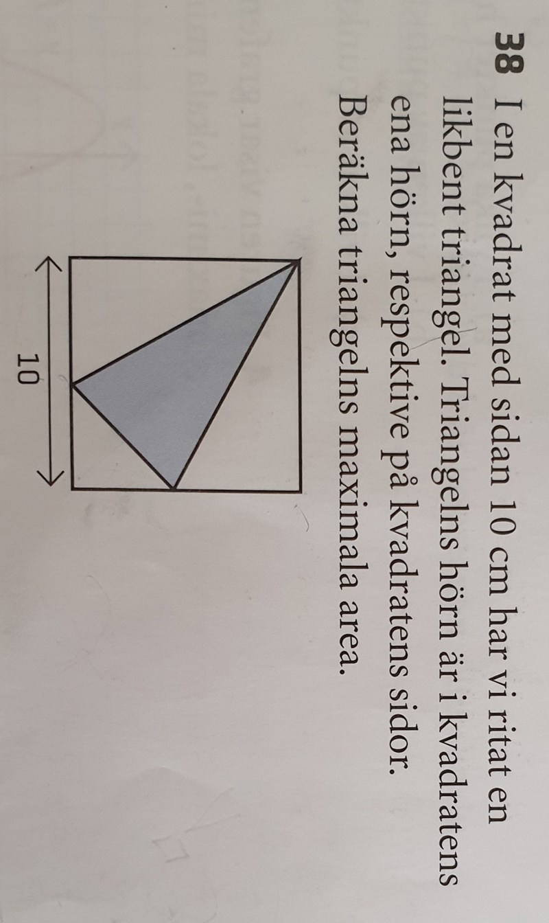 Okej så det jag vet är att jag behöver ett uttryck som jag sedan kan derivera för att få fram maximala arean. Jag är jätteförvirrad över hur jag ska göra det. Jag har försökt i flera timmar att få nått uttryck på den här triangeln. Skulle uppskatta om någon skulle kunna skriva hur man kommer fram till ett sådant uttryck för jag verkar inte kunna,  inte ens med ledning.
