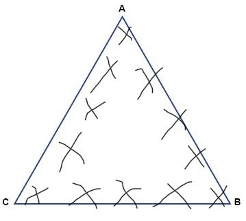 Rita en bild av en triangel och placera ut kryss längs med kanterna där det står granar.