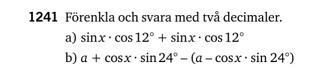 cos x * sin (24) + cos x * sin (24) : här tänkte jag att det skulle bli 2 cos x, men det blir det ju inte av nån anledning utan vi får sin (24)* 2= 0,81 , och svaret blir 0,81*cos x . Blir det inte 0,81*2 cos x för att hela parentesen (cos x*sin(24)) är en enhet? Och man multiplicerar den en gång med 2, inte två gånger?