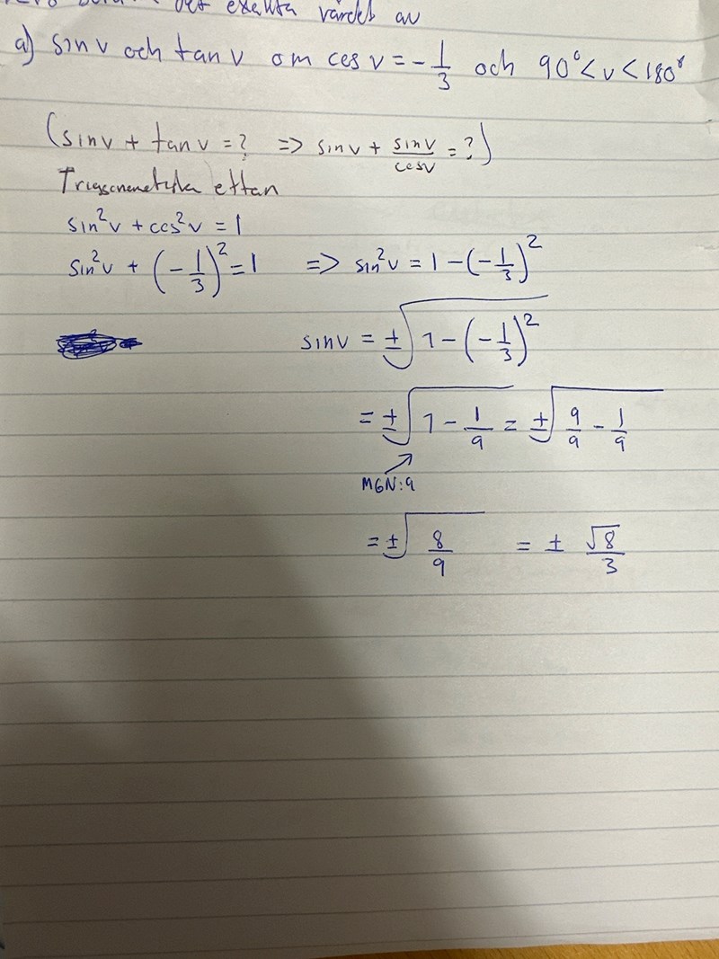 Inom intervallet 90<v<180 grader, så måste det vara ett positivt värde (√8)/3 eftersom sinv är i andra kvadranten (y)