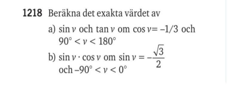 Som du skrivit i rubriken så kan du använda triggettan. Då kvarstår frågan om vilket tecken sinv ska ha, vilket du kan se i enhetscirkeln i vilken kvadrant som vinkelintervallet ligger.