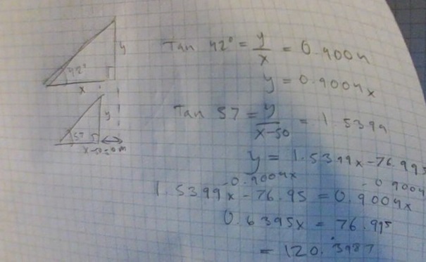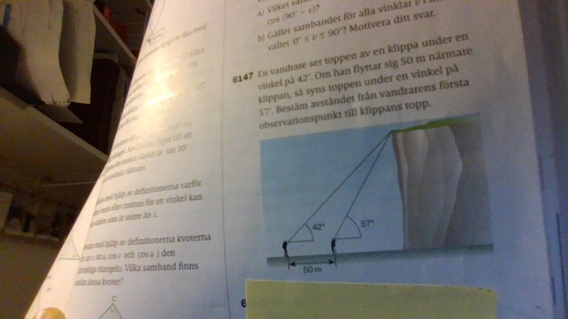 Men dom frågar efter avståndet till klippans topp, dvs hypotenusan i din första triangel