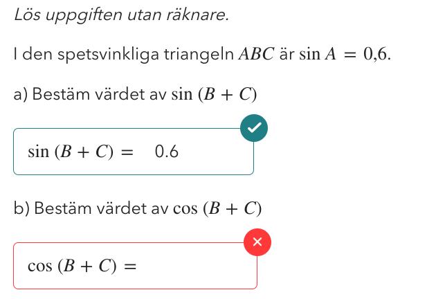 ABC är spetsvinklig, vilket gör att vinkeln A bara kan ha ett värde som är < 90. Då måste 180>B+C >90 dvs ( B+C) ligger i andra kvadranten där cos är negativ. Trigonometriska ettan ger sedan absolutvärdet.